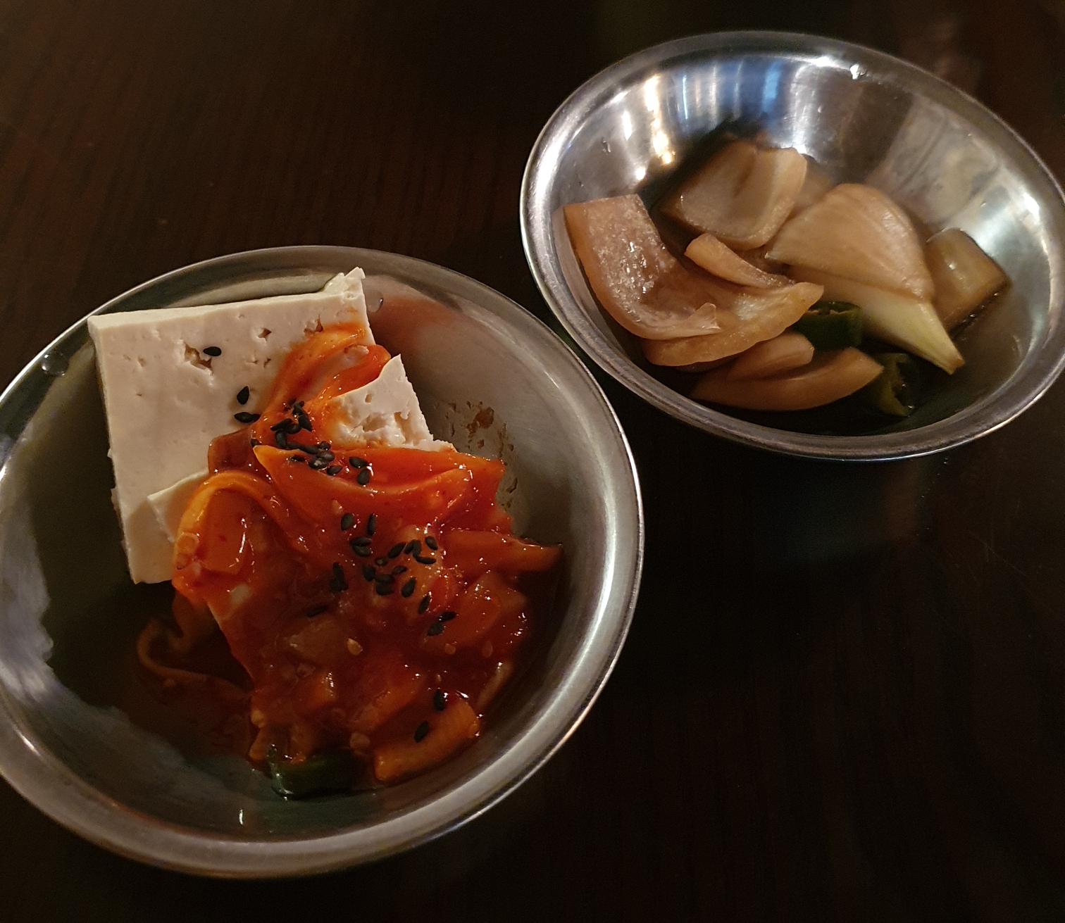 기본안주로 보이는 두부+젓갈 과 양파 짱아치가 먼저 왔어요.