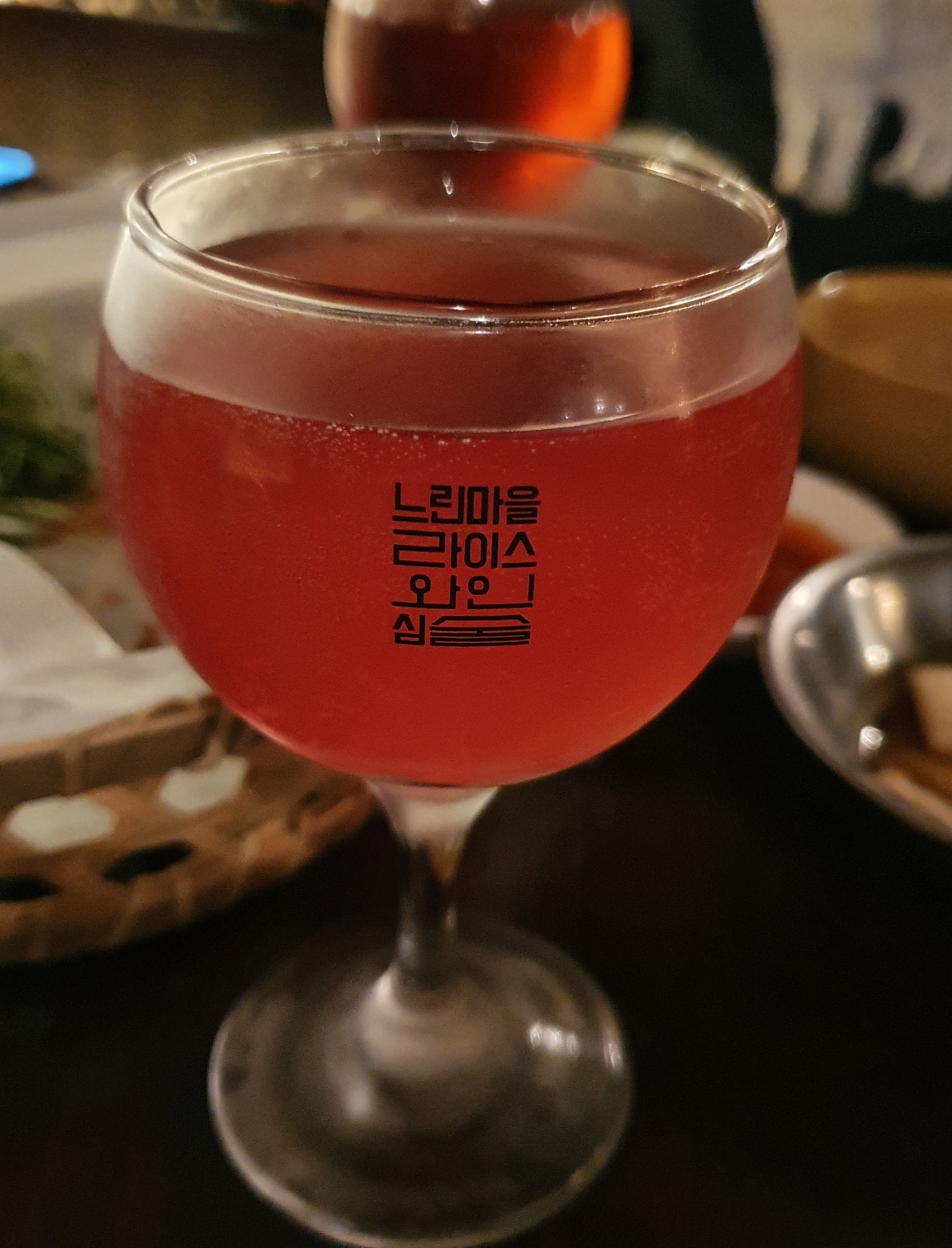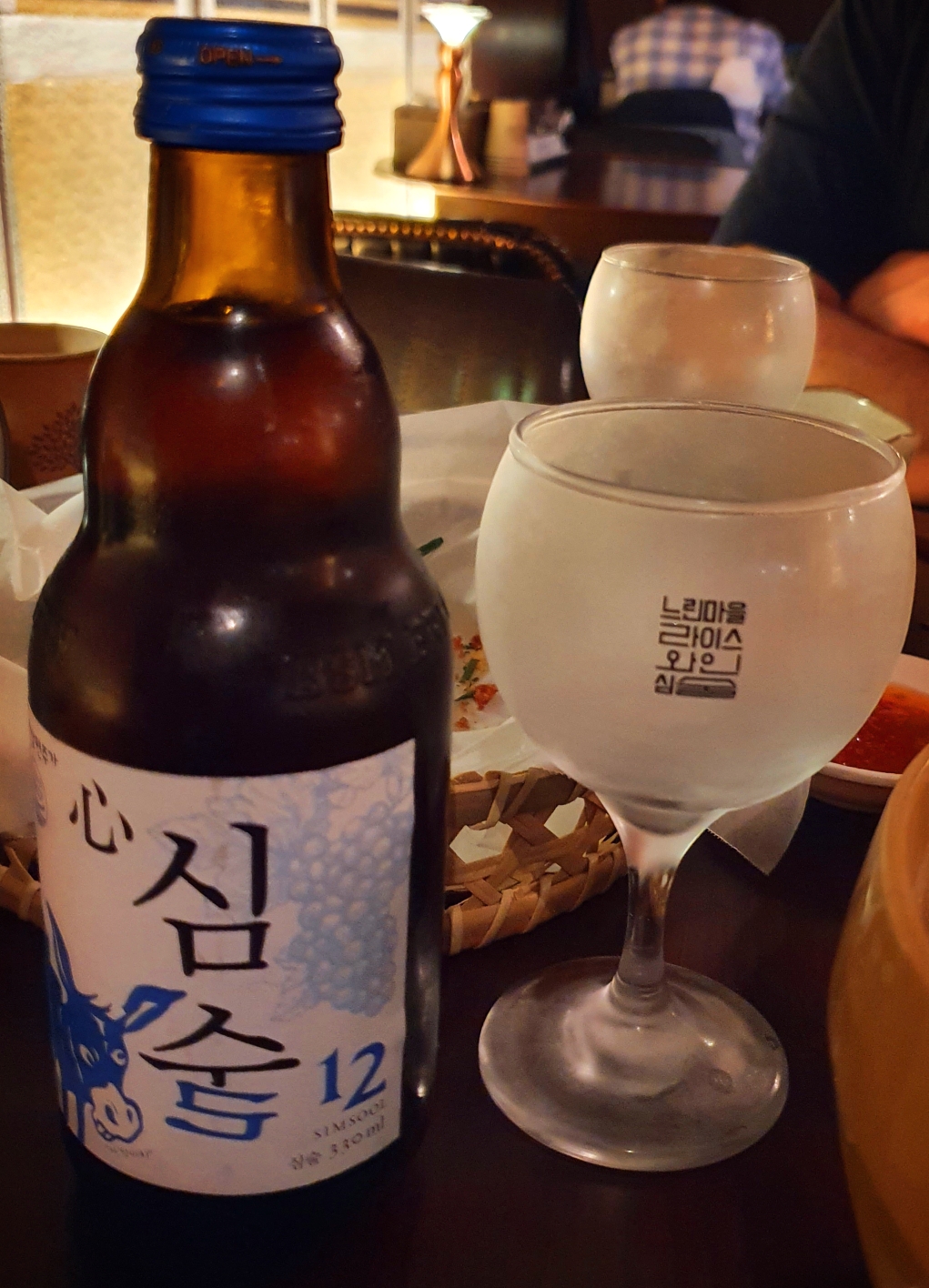 소주인줄 알았는데, 와인이었어요. 심술전용 와인잔이 함께 나왔어요. 가득 따르면 전용잔에 딱 두잔이 나온답니다.