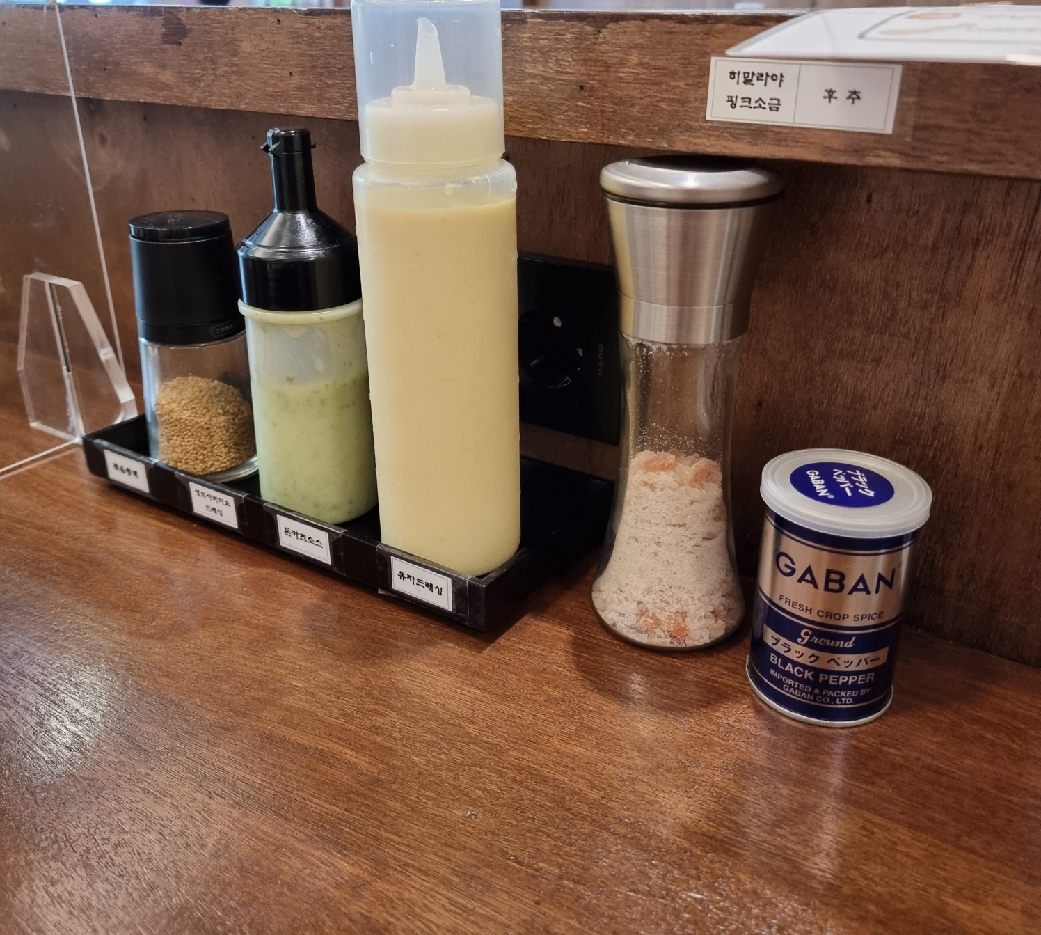 전좌석이 카운터석으로 되어있는데, 참깨, 와사비소스, 유자드레싱, 히말라야 핑크소금이랑 일본 후추가 있었습니다.