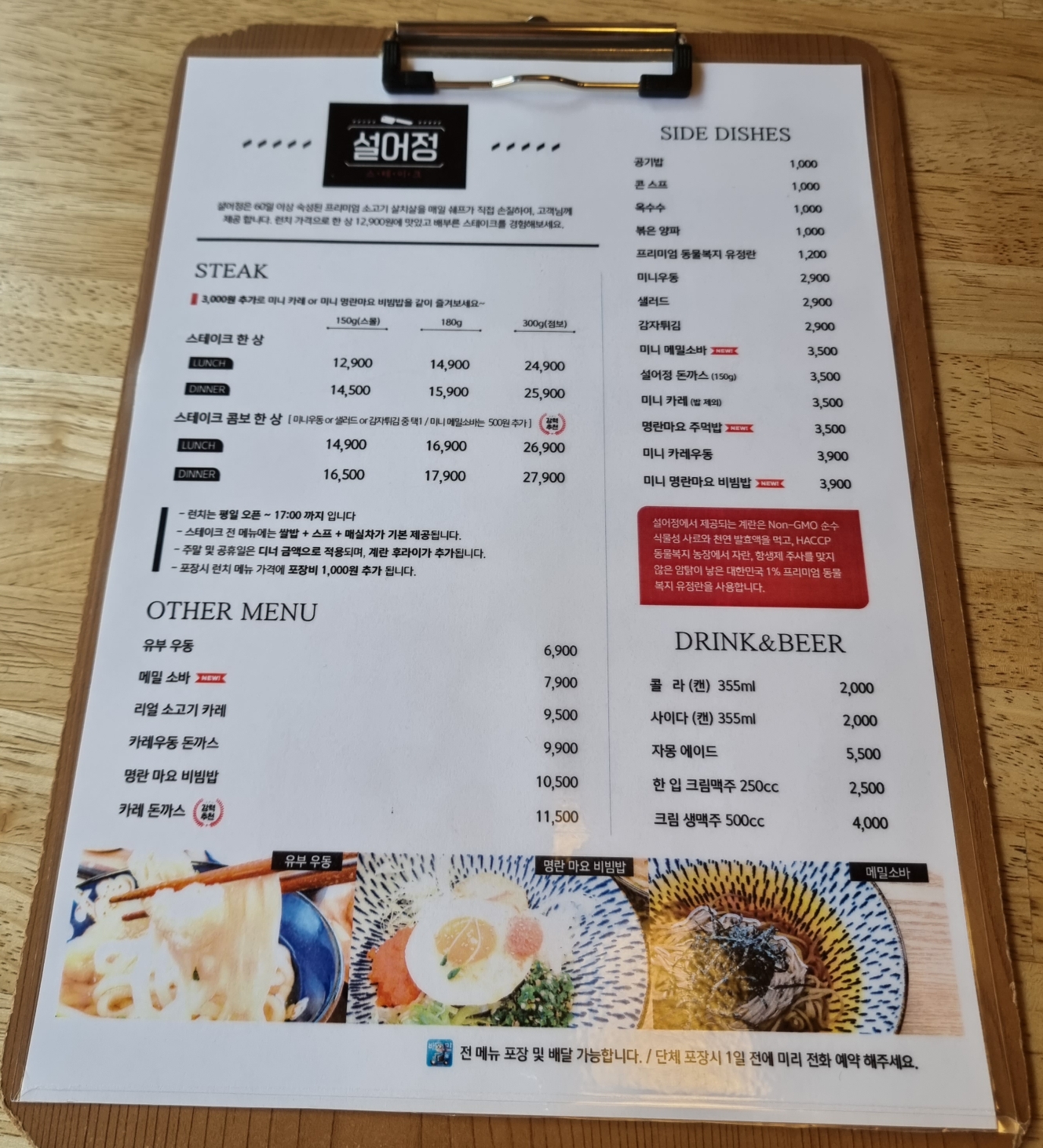 안내사항과 스테이크 맛있게 먹는법이 테이블마다 안내되어 있습니다.