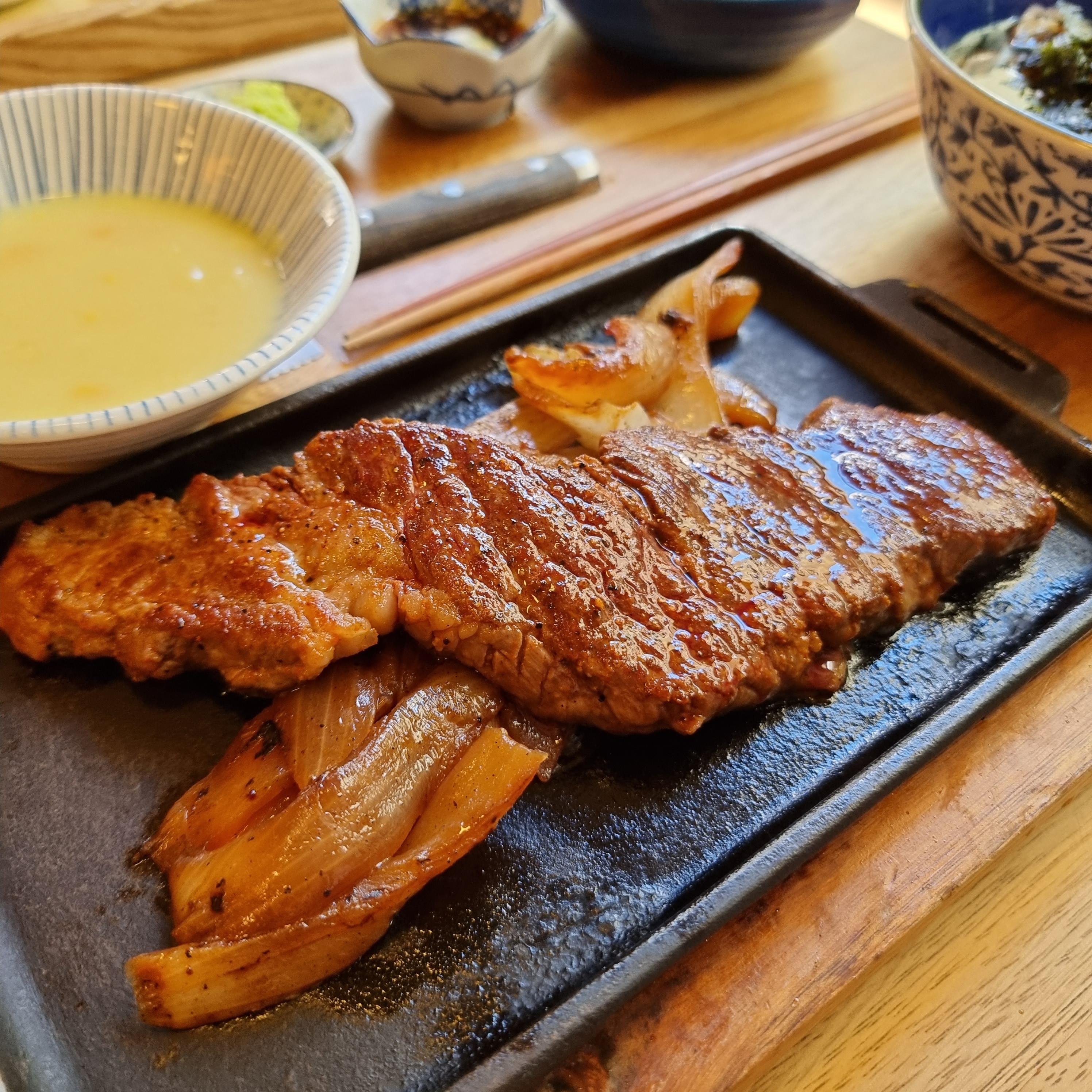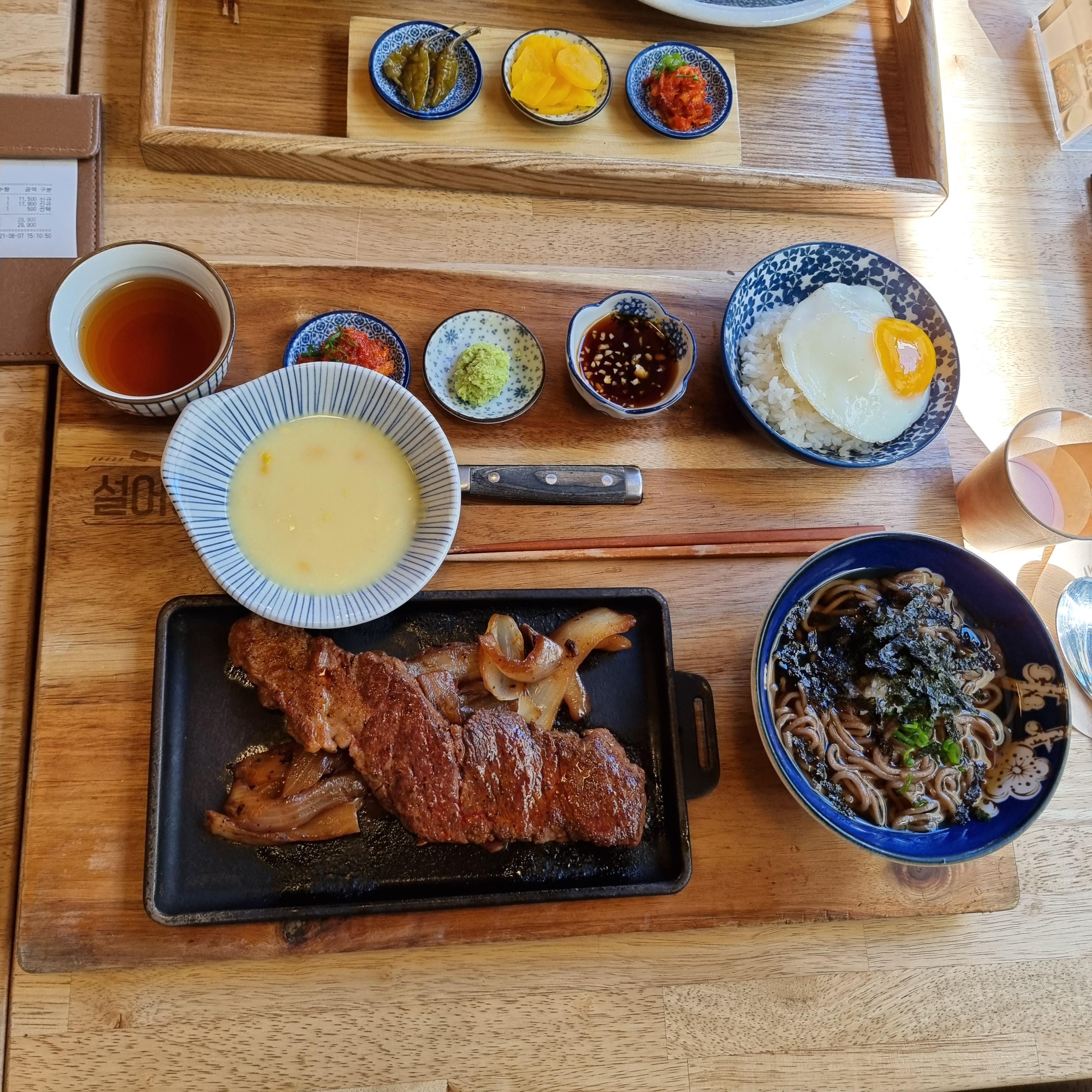 스테이크 콤보 한상입니다. 고기는 180g으로 했구요. +500 으로 우동을 메밀소바로 변경했어요.