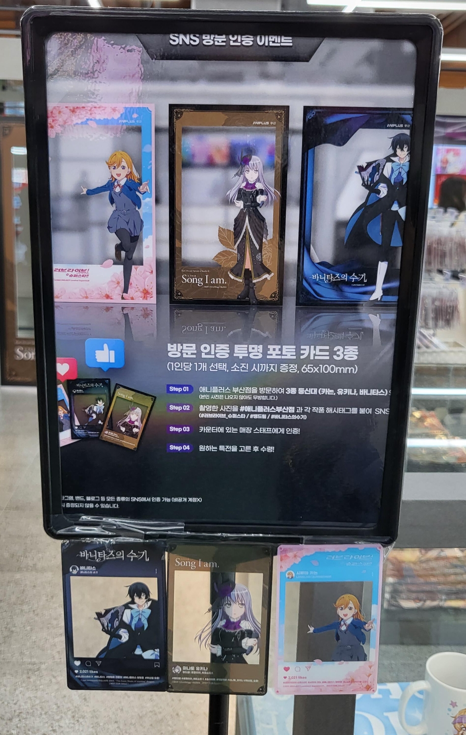 위의 3종 등신대를 사진찍고 SNS에 올리고 직원에게 보여주면 투명카드를 증정하는 이벤트를 하고있어요.