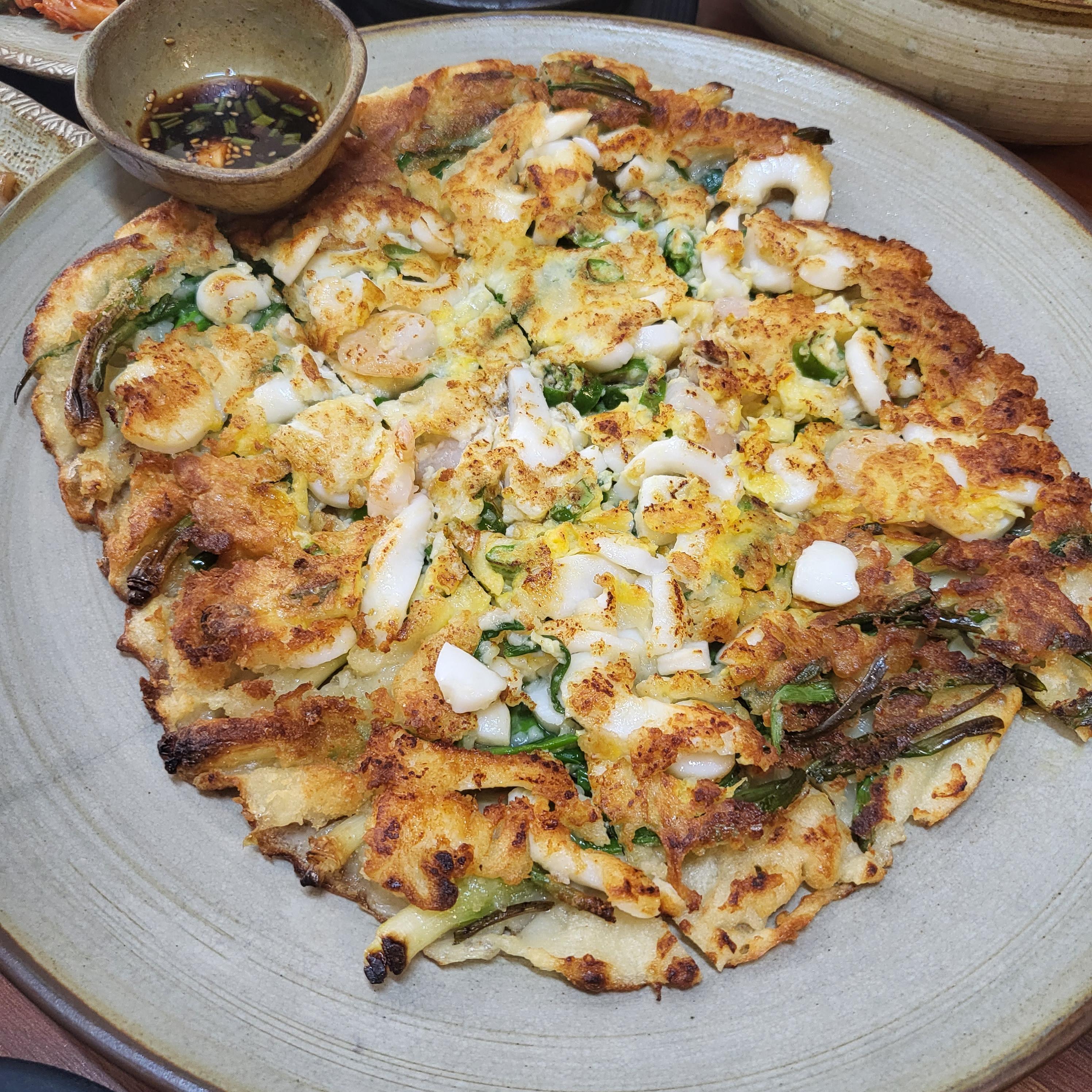 오늘은 해물파전도 주문해봤어요. 사진은 작아보이는데 사이즈가 많이 커요.